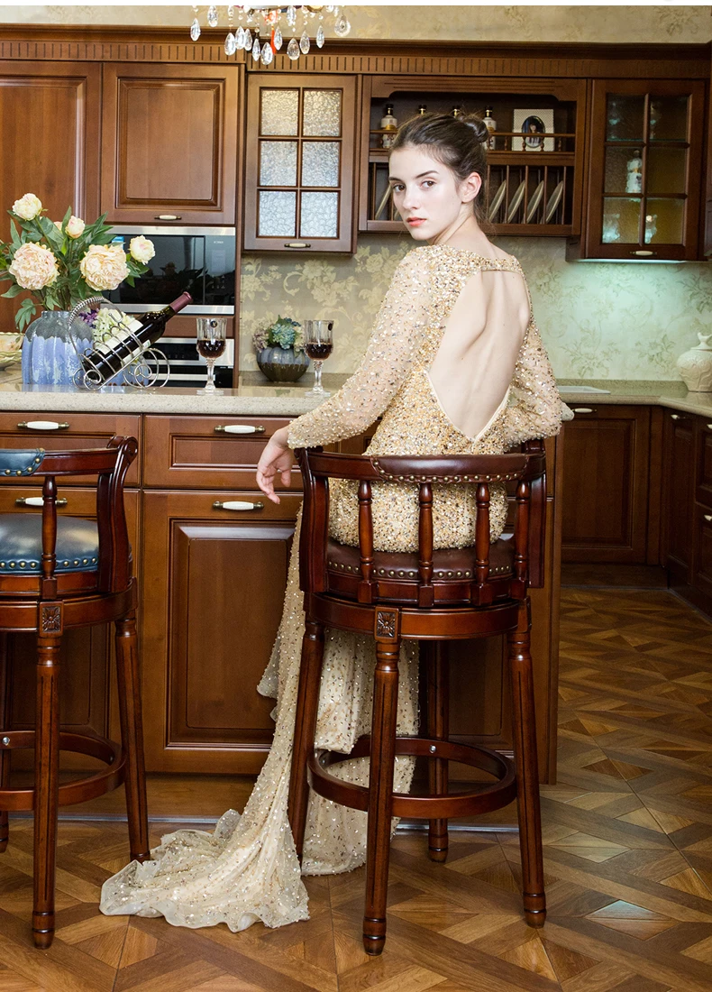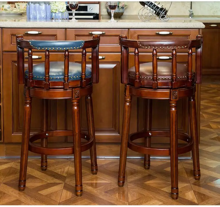 American-style solid wood bar chair. European backrest stool. Leather revolving bar chair.